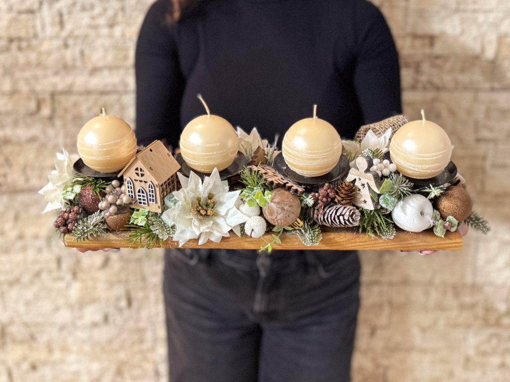 Adventní svícen s bílou vánoční hvězdou a přírodní stuhou