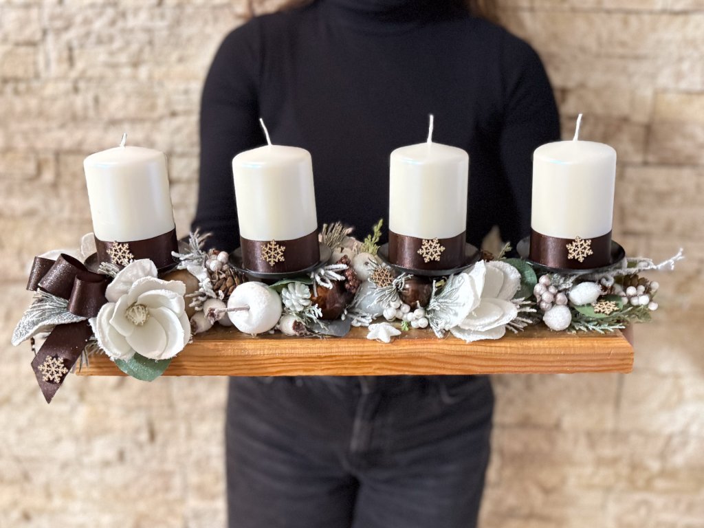 Adventní svícen s bílými svíčkami a hnědou stuhou