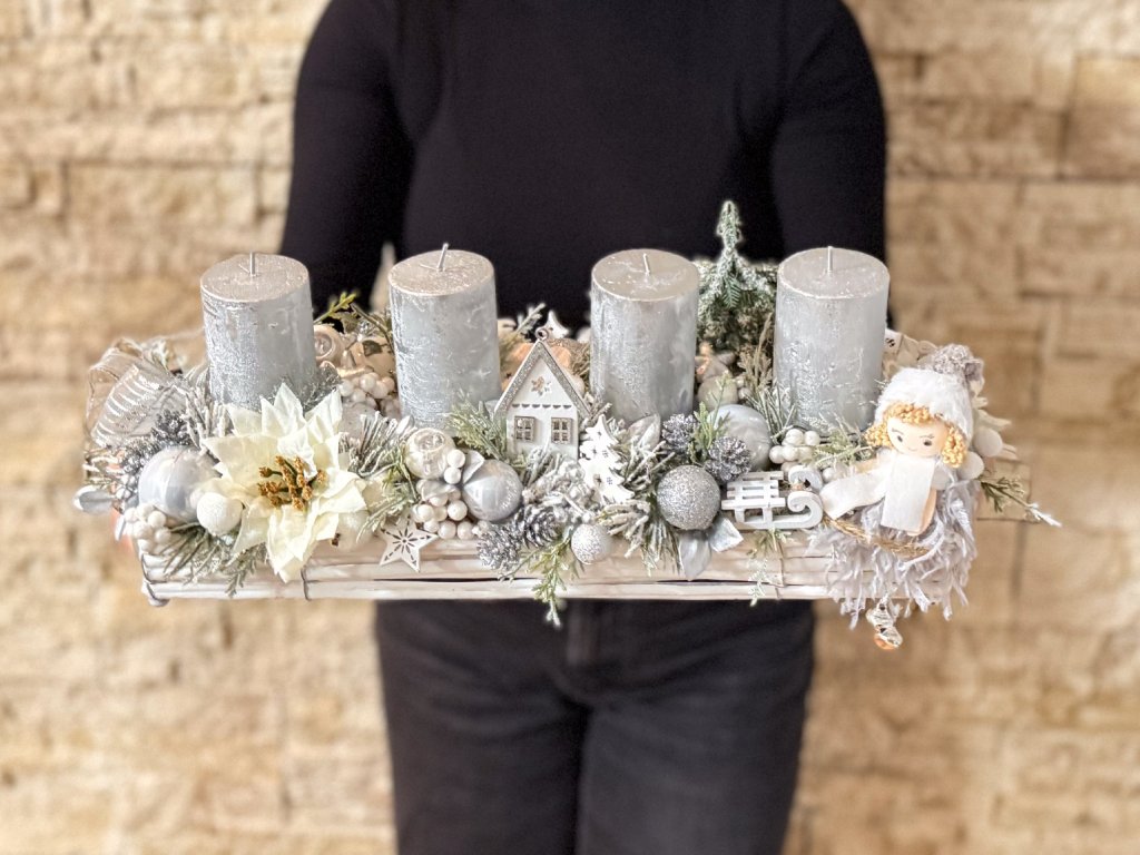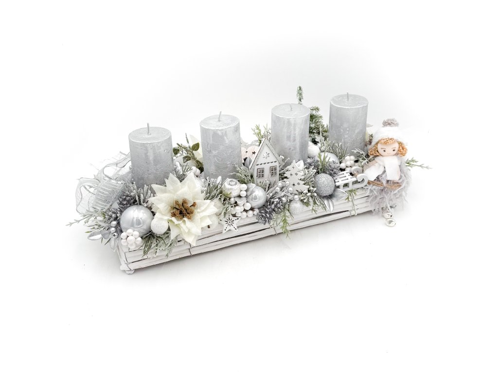 Adventní svícen se stříbrnými svíčkami
