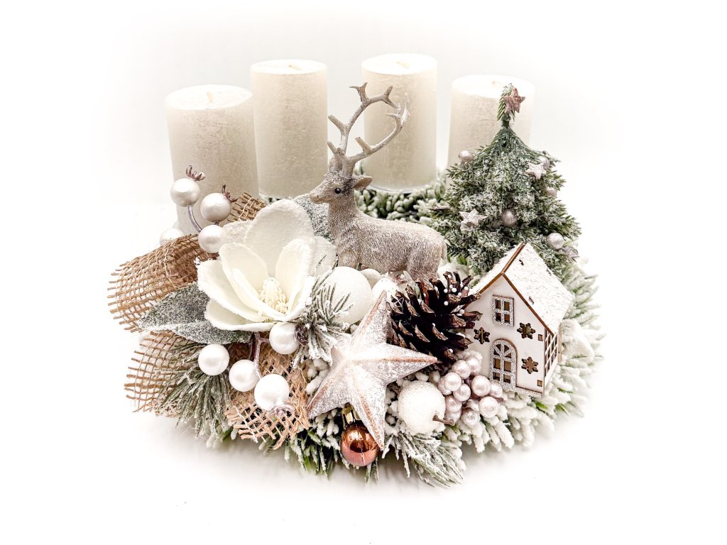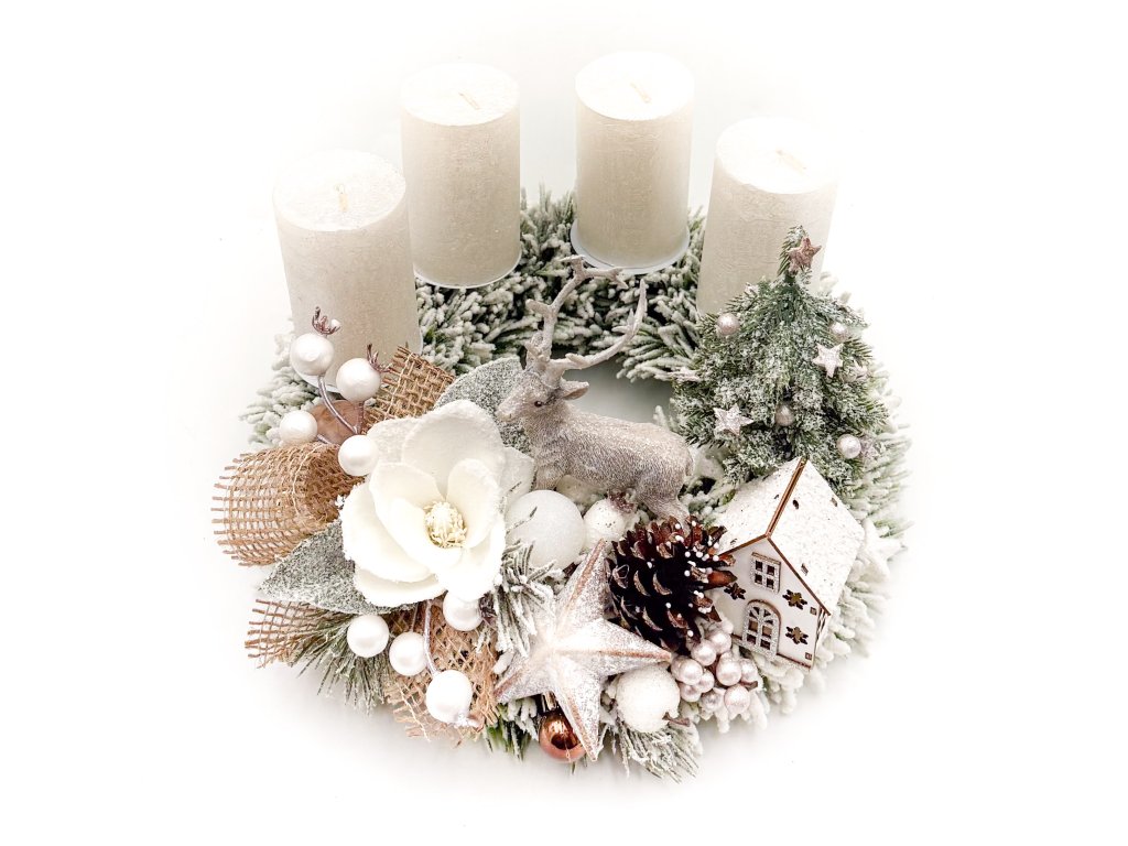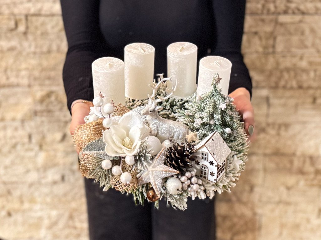 Zasněžený adventní věnec s rustikálními svíčkami.