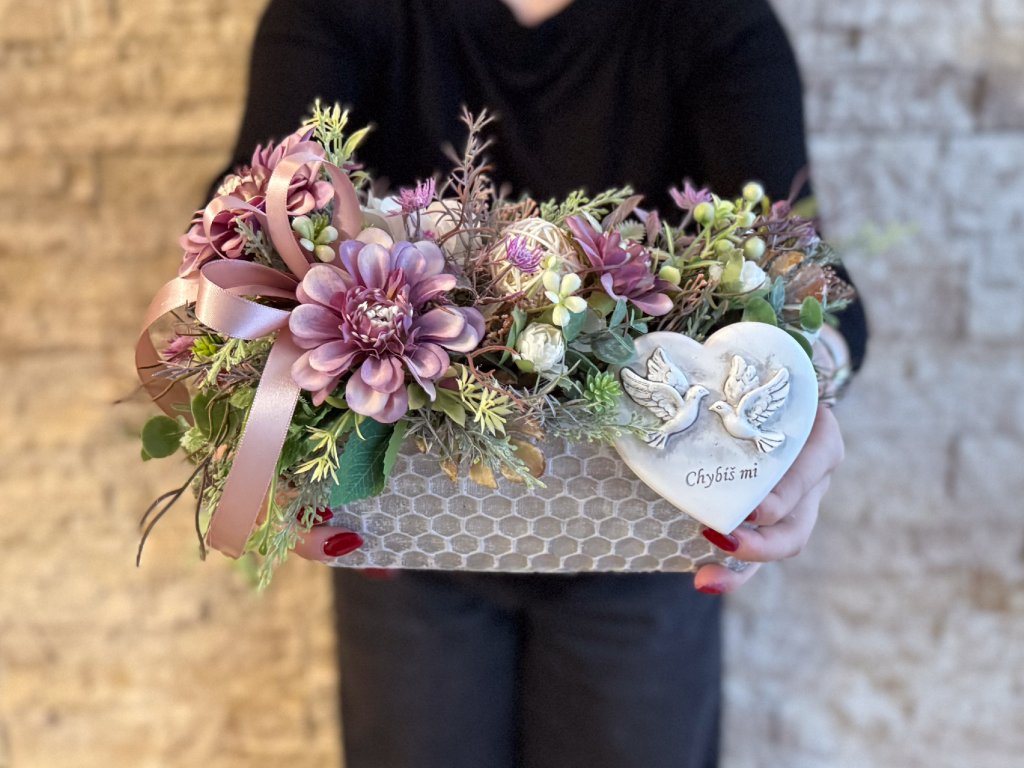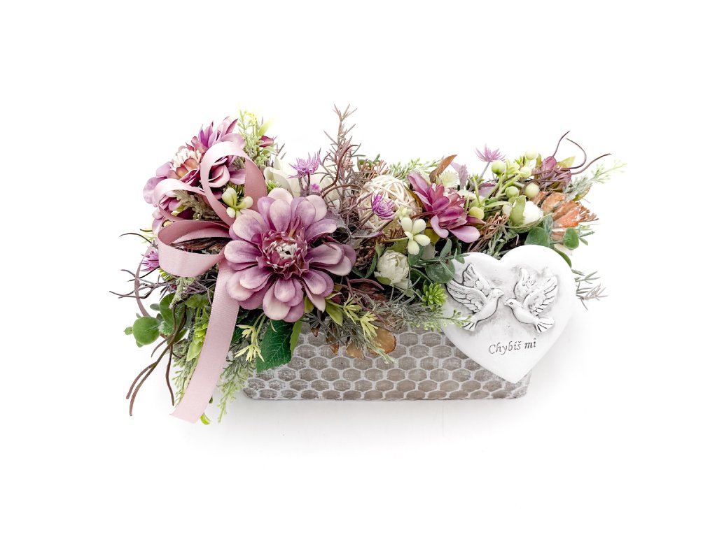 Miska aranžmá je zatížená, takže dekorace odolá i větru. Aranžmá není nutné podkládat. V závislosti na dostupnosti materiálu u dodavatele se může mírně lišit typ použitých květů a dekorace s nápisem.