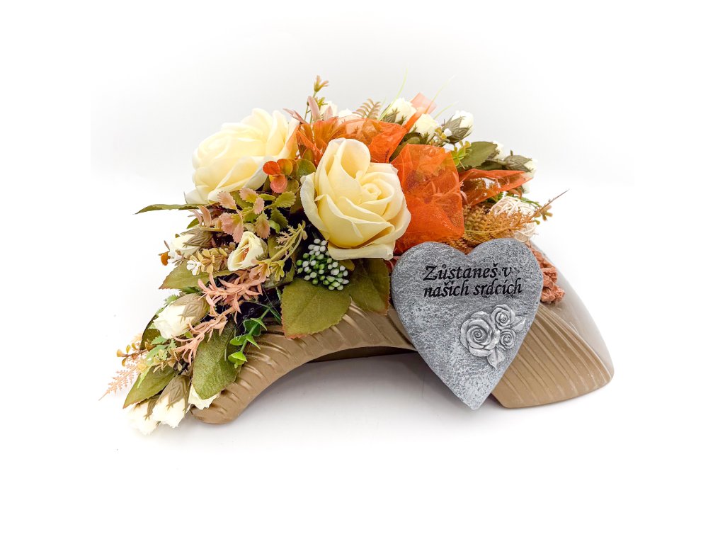 Miska aranžmá je zatížená, takže dekorace odolá i větru. Aranžmá není nutné podkládat. V závislosti na dostupnosti materiálu u dodavatele se může mírně lišit typ použitých květů a dekorace s nápisem.