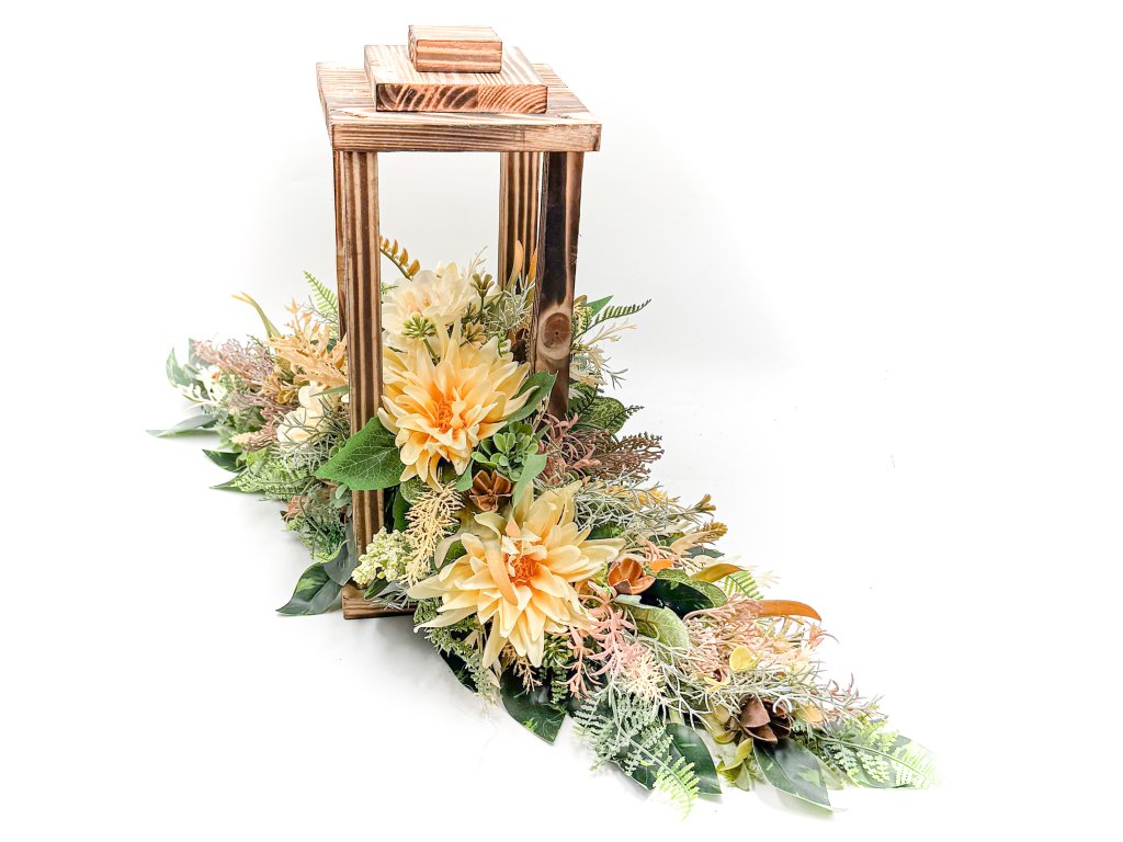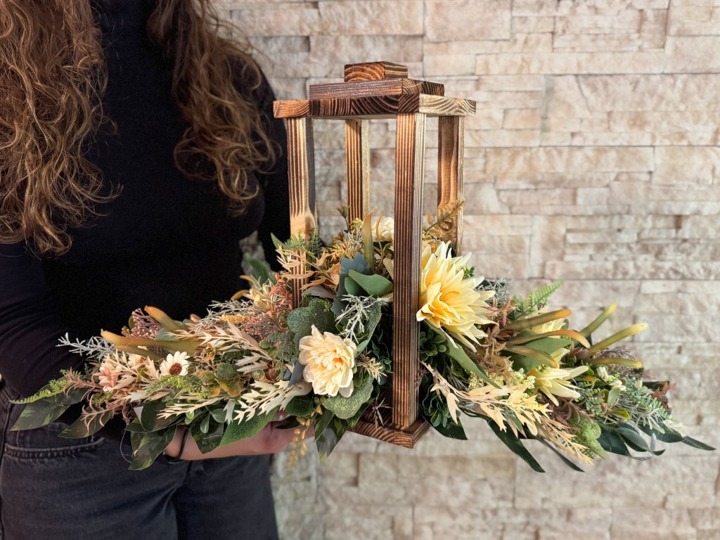 Dřevěnou lucernu jsme doplnili o květy v béžové barvě. Krásná mohutná dekorace vhodná i na dvojhrob.