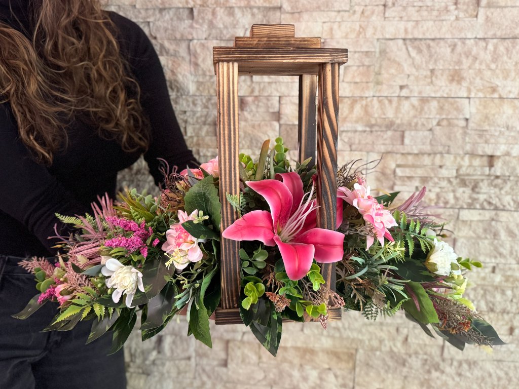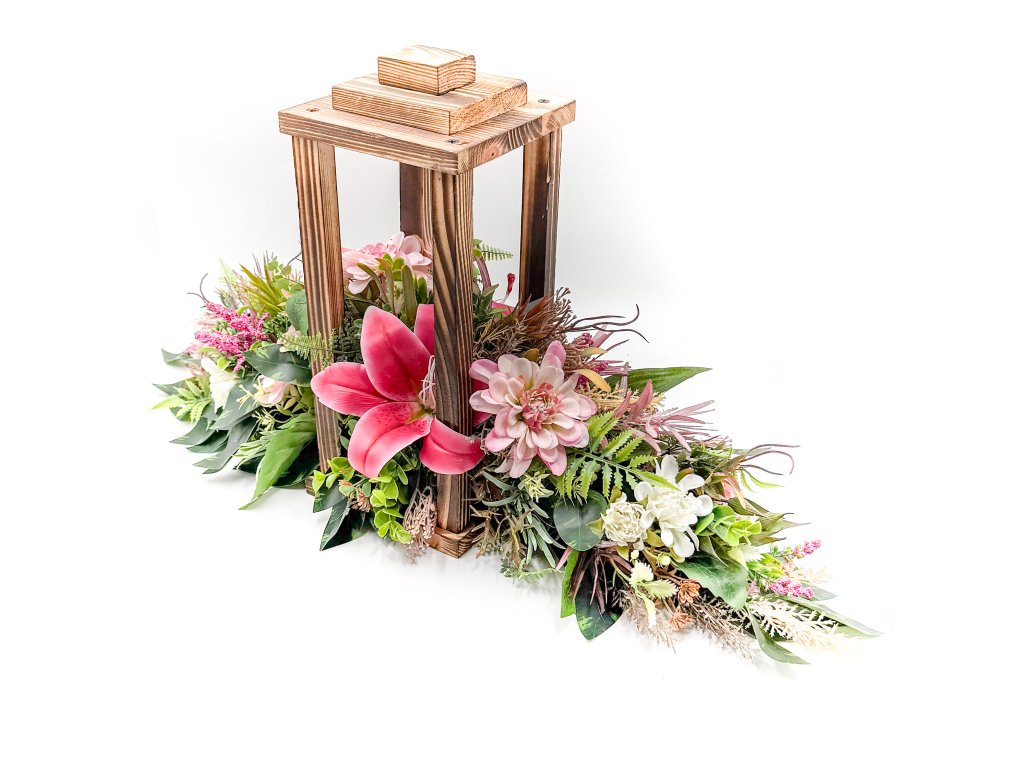 Dřevěnou lucernu jsme doplnili o květy v růžové barvě. Krásná mohutná dekorace vhodná i na dvojhrob.