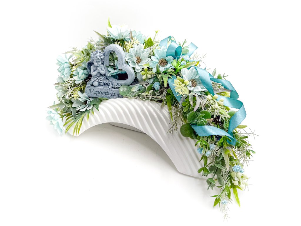 Květinová smuteční dekorace na hrob laděná do modré barvy doplněná o anděla se srdíčkem z polyresinu.