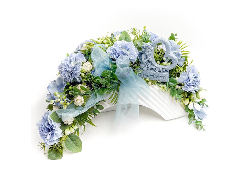 Květinová smuteční dekorace na hrob laděná do modré barvy doplněná o anděla se srdíčkem z polyresinu.