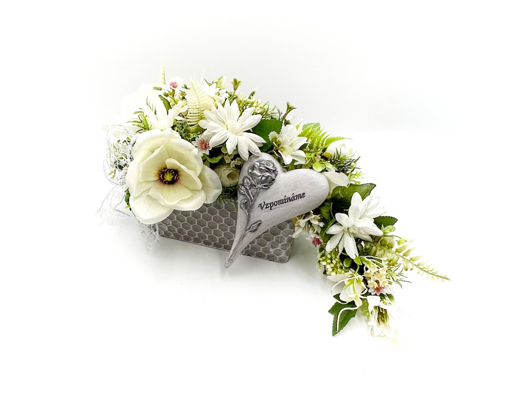 Aranžmá pro uctění památky s elegantní kombinací bílých květin. Doplněn bílou stuhou a srdíčkem.