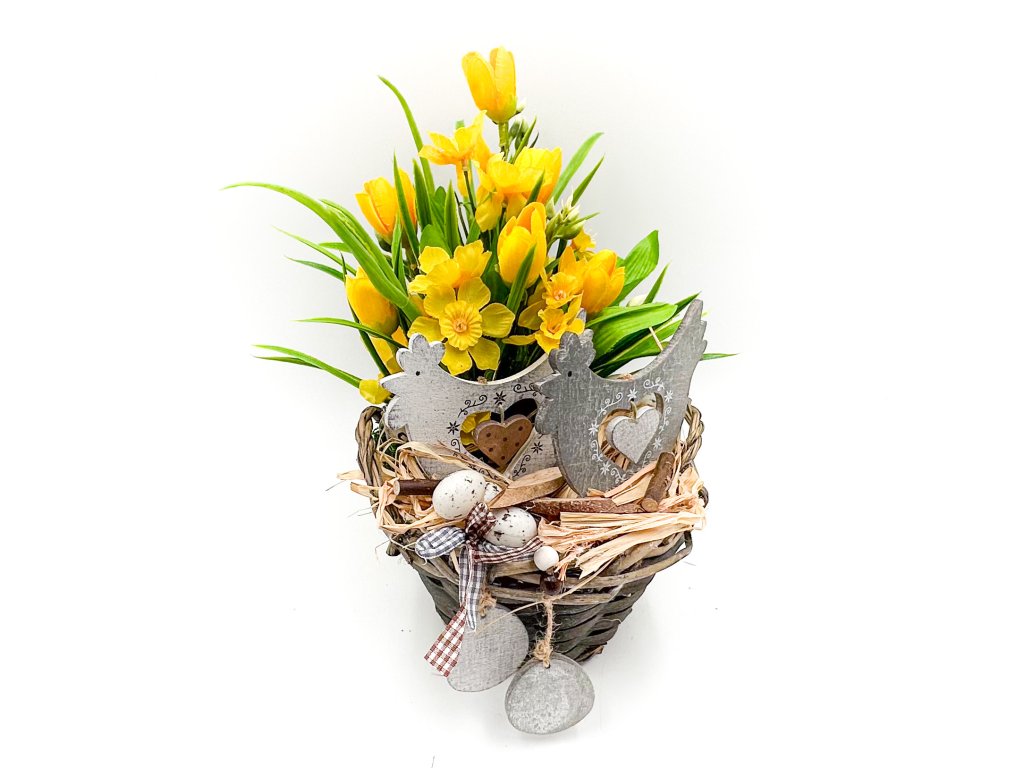 Přírodní košíček vyplněný slepičkami, vajíčky, krokusy a mini narcisy.