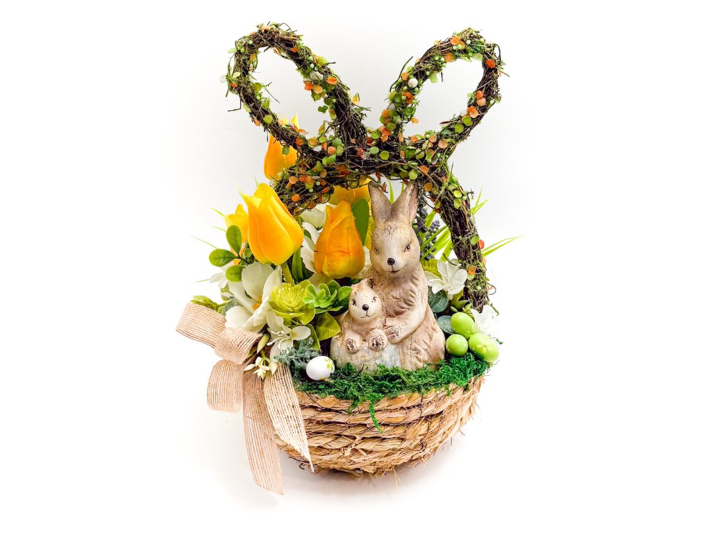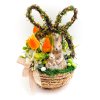 Velikonoční dekorace v přírodním proutěném košíku. Aranžmá obsahuje mix jarních květin s roztomilou figurkou zajíčků a velikonočních mini vajíček.