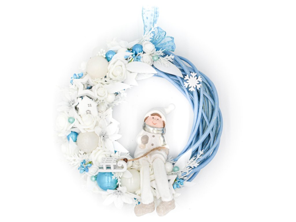 Věnec, který na vašich vchodových dveřích vynikne. Použili jsme proutěný korpus modré barvy, který jsme dozdobili vánočními bílými květy, dřevěnými výseky a baňkami na jedné straně. Zdobení jsme doplnili o panáčka, který je posazený uprostřed věnce. Nechte na sebe dýchnout vánoční atmosféru pokaždé, když se budete vracet domů. K věnci je připevněna stužka na zavěšení.