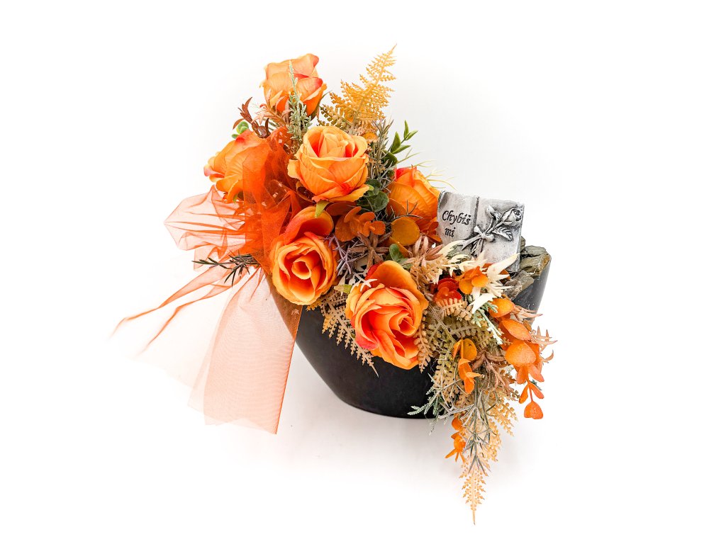 Aranžmán s oranžovými květy. Šedou misku jsme dále doplnili o mašli a dekoraci s nápisem. Miska aranžmánu je lehce zatížená, a tak odolá menšímu větru.