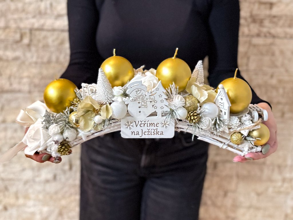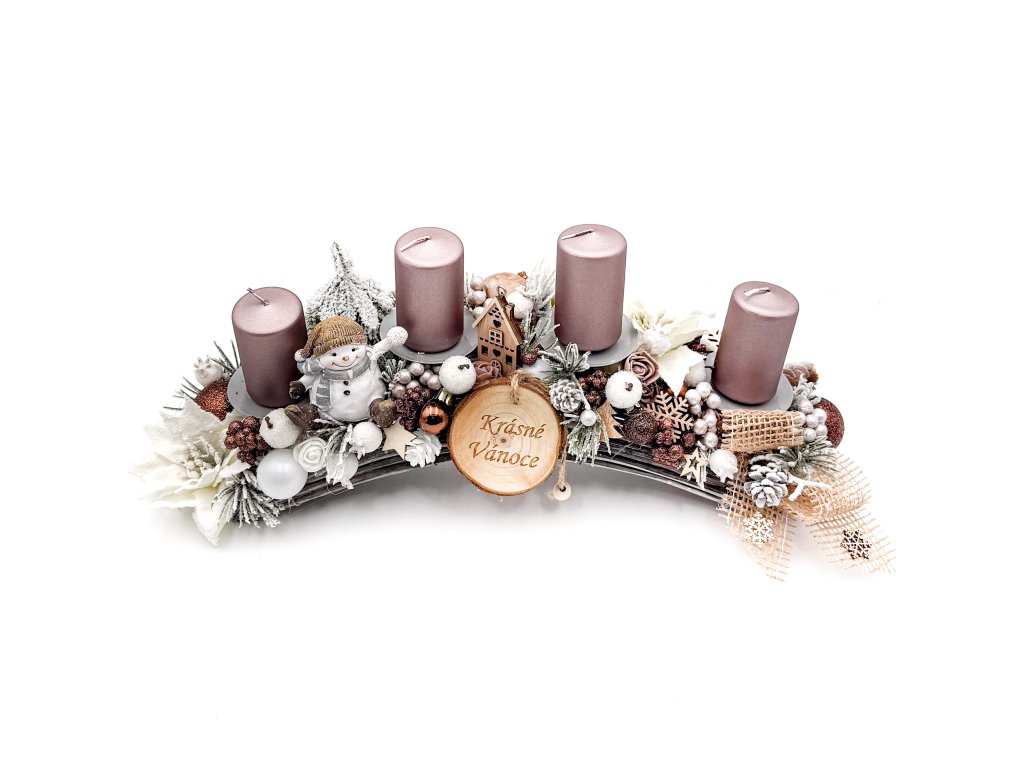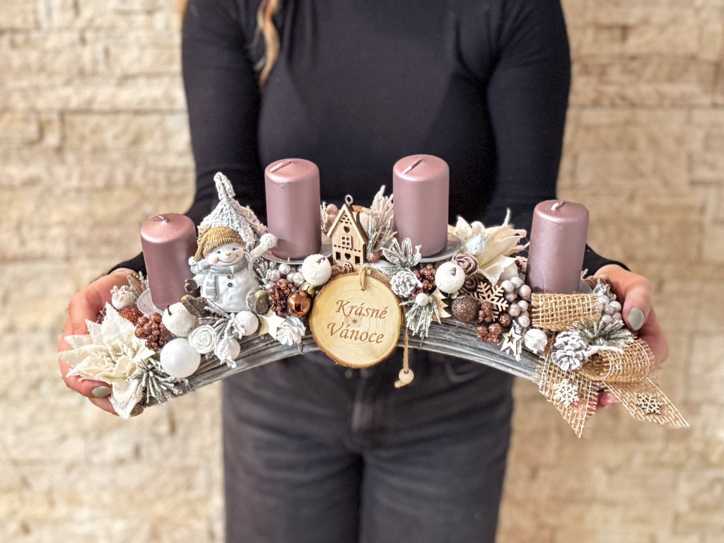 Prohnutý základ jsme dozdobili adventními svíčkami, baňkami a dalšími prvky. Svícen je velmi bohatě zdobený.